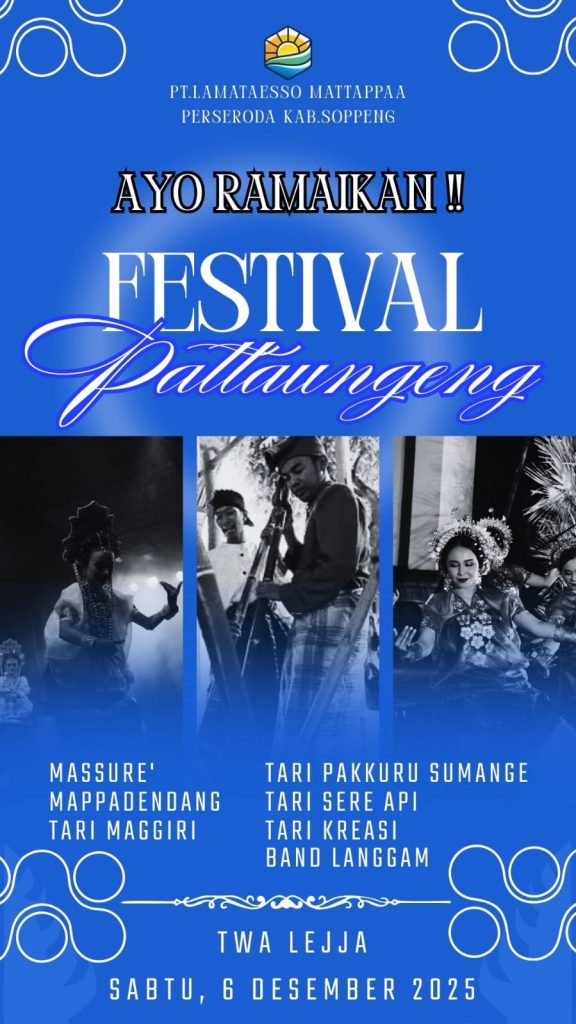 SOPPENG — Tradisi adat Bugis Pattaungeng kembali digelar pada tahun ini dengan mengusung tema “Ade’ Malebbina Soppeng”. Prosesi budaya yang sarat nilai kearifan lokal tersebut akan berlangsung pada 6 Desember 2025 di kawasan Taman Wisata Alam (TWA) Lejja, salah satu destinasi unggulan Kabupaten Soppeng. Pattaungeng merupakan tradisi tahunan masyarakat Bugis, khususnya di Soppeng yang biasanya […]